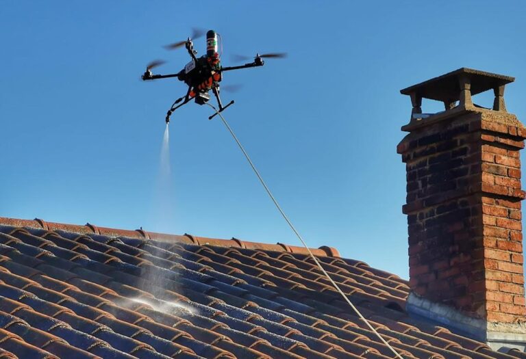Le nettoyage par drone repose sur l’utilisation d’un drone professionnel équipé d’un système de pulvérisation haute précision. Celui-ci diffuse un produit nettoyant ou un traitement anti-mousse directement sur la toiture ou la façade, sans contact direct et sans intervention humaine sur le toit.